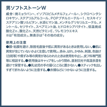 - 焼ミョウバン、イソプロピルメチルフェノール その他成分…シクロペンタシロキサン、ステアリルアルコール、POPブチルエーテルー1、セスキイソステアリン酸ソルビタン、水添ヒマシ油、メンチルグリセリルエーテル、メントール、セリサイト、スペアミント油、ヒドロキシアパタイト、低温焼成酸化Zn、酸化Zn、天然ビタミンE、ワレモコウエキス