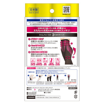 医学にもとづく段階圧力設計・・・メディキュットは英国の医療用ストッキングがルーツ。その圧力数値は、英国の圧力値標準規格をもとに設定。はくだけで、脚をキュッとひきしめ軽くします。