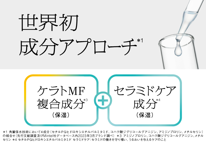 *1 角層保水技術において4成分(セチルPGヒドロキシエチルパルミタミド、コハク酸ジグリコールグアニジン、アミジノプロリン、メチルセリン)の組合せ(先行文献調査及びMintel社データベース内2023年3月ブランド調べ)
