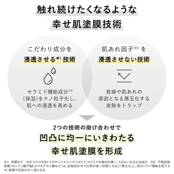 こだわり成分を浸透させる※1技術と肌あれ因子※3を浸透させない技術、この相反する2つの技術の掛け合わせで、凹凸に均一にいきわたるなめらかな密閉浸透膜を形成。成分やうるおいを肌に送り込み続けながら※1、うるおいを閉じ込めます。