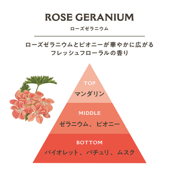 ローズゼラニウムとピオニーが華やかに広がるフレッシュフローラルの香り。