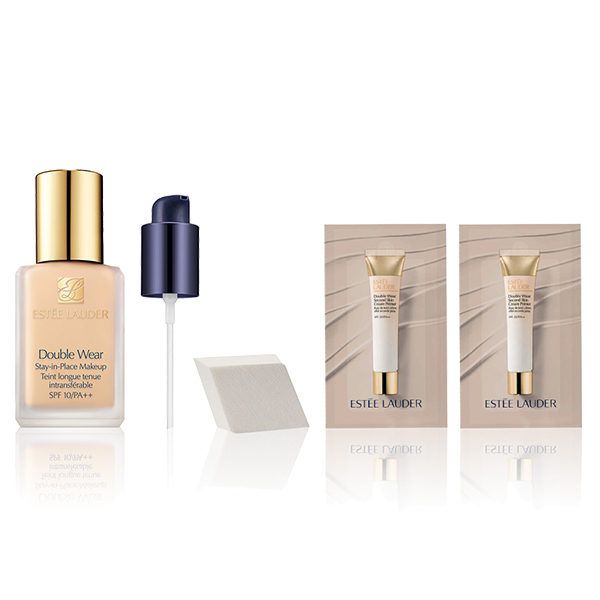 パーフェクトな美肌感が続くエスティローダーのNo.1*2ファンデーションの「ダブル ウェア ステイ イン プレイス メークアップ」現品と専用ポンプ、プロのように仕上げることができるメークアップ スポンジ、ダブル ウェア ファンデーションと相性抜群の化粧下地も試せる@cosme SHOPPING限定セット。