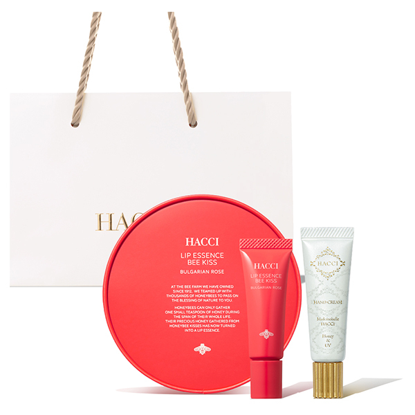 ブルガリアンローズのはちみつを贅沢に使用し、じゅわっと多幸感のある血色に染めるフレッシュなロージーカラーの『モイスト リップエッセンス BEE KISS ローズ』と、はちみつ、みつろう、ローヤルゼリーエキスなどの蜂由来成分を配合し、しっとりするのにベタつかずみずみずしい感触の『ハンドクリーム マドモワゼルHACCI 』で乾燥が気になる時期に唇も指先も潤うセット。