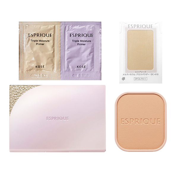 高濃度*美容液でコーティング、粉感なく肌に溶け込みフィットするパウダーファンデーション「メルティセラム グロウパウダー 」に、ケースと人気のプライマー2色のサンプルがついたお得な限定キット。