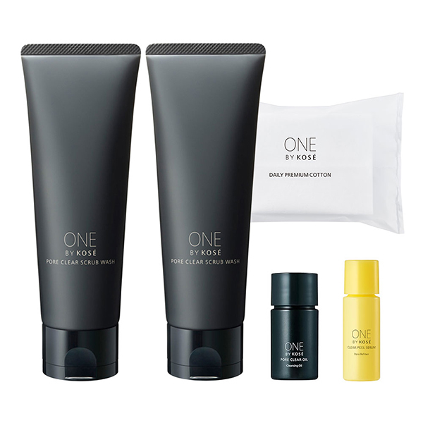 毛穴汚れを根本から洗浄、毎日使えるスクラブ洗顔料「ポアクリア スクラブ ウォッシュ」に、毛穴角栓・黒ずみケアできるクレンジング「ポアクリア オイル」とふきとり美容液「クリアピール セラム」のミニサイズがついたお得な限定キット。