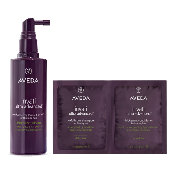 植物由来成分が地肌に素早くなじみ、コーティング成分で髪の根元にコシを与えるヘアデンスケア* 用のスカルプ セラム現品に、やわらかくなめらかな軽い仕上がりのシャンプーとコンディショナーのお試しサイズ入りの限定セット。