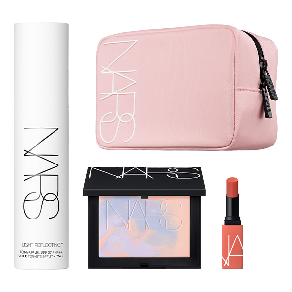 マーブル状に施されたラベンダーカラーが肌に柔らかな光沢感を与えるプリズマティックパウダーと、肌トーンを明るく均一に整えるスキンケアプライマーに、クリーム状からマットに仕上がる濃密なピーチコーラルのパワーマットリップスティック特製サイズとポーチがついた限定キット。