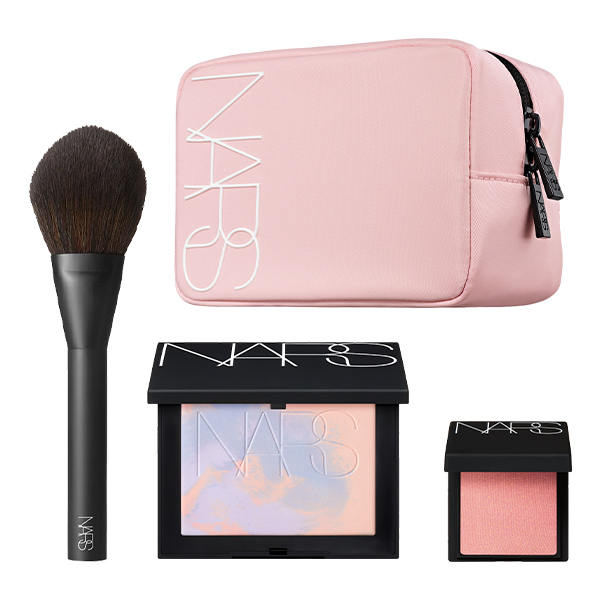 マーブル状に施されたラベンダーカラーが肌に柔らかな光沢感を与えるプリズマティックパウダーと、パウダーをふんわりとのせ肌を磨き上げるのに最適な大きめのブラシに、にじみ出るような発色で頬を染めるブラッシュ Nからピーチピンクの777 特製サイズとポーチがついた限定キット。