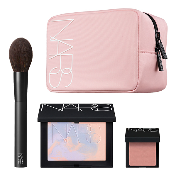 マーブル状に施されたラベンダーカラーが肌に柔らかな光沢感を与えるプリズマティックパウダーと、ハイライトやブロンザーにも適した大きめのブラシに、にじみ出るような発色で頬を染めるブラッシュ Nからモーヴピンクカラーの900 特製サイズとオリジナルポーチがついた限定キット。