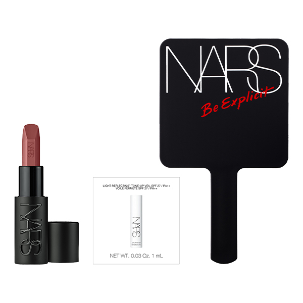 艶やかなサテン仕上げの「エクスプリシット リップスティック」に、肌トーンを均一に整えるスキンケアプライマーのサンプルとNARS特製ミラーがついた限定キット。