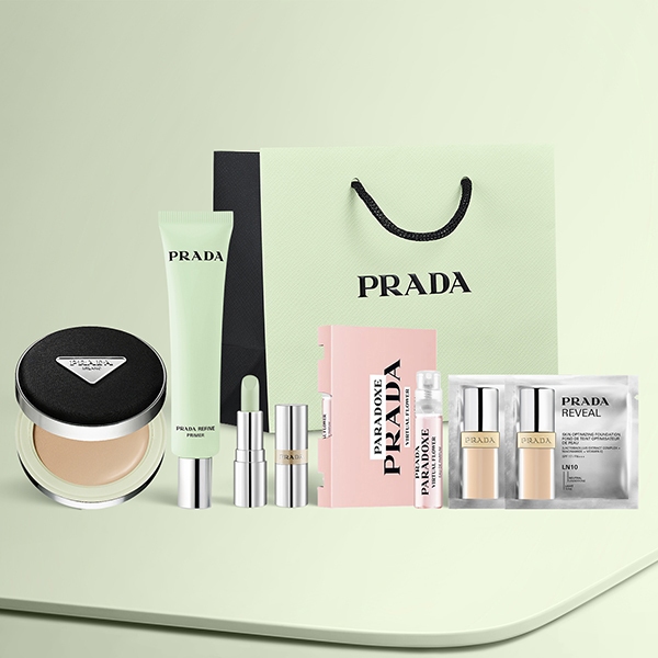「プラダ メッシュ クッション」と一緒にお使いいただける「リファイン ブラーリング エクステンディング プライマー」に加え、プラダ ビューティ を代表するアイコン製品のお試しサイズも一緒にお楽しみいただけます。