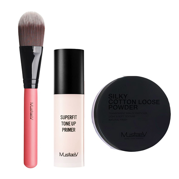 トーンアッププライマー・ルースパウダー・ファンデーションブラシを組み合わせ、ベースメイクの仕上がりに差がつくプロ仕様に。