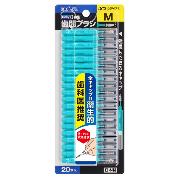 歯科医推奨、日本製キャップ付歯間ブラシ(I字型・ワイヤータイプ)。1本毎にキャップが付いているので、使用前も使用後も衛生的で、保管・携帯にも便利。また、キャップで柄の延長もできるので、奥歯の歯間にも届きやすく、すき間に入りやすい。