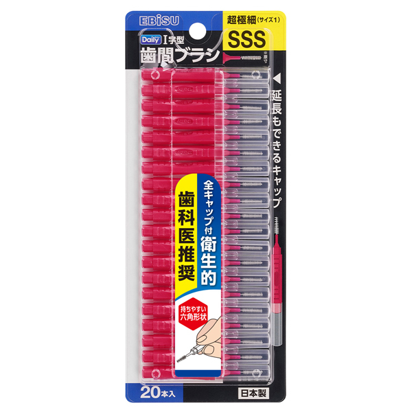 歯科医推奨、日本製キャップ付歯間ブラシ(I字型・ワイヤータイプ)。1本毎にキャップが付いているので、使用前も使用後も衛生的で、保管・携帯にも便利。また、キャップで柄の延長もできるので、奥歯の歯間にも届きやすく、すき間に入りやすい。