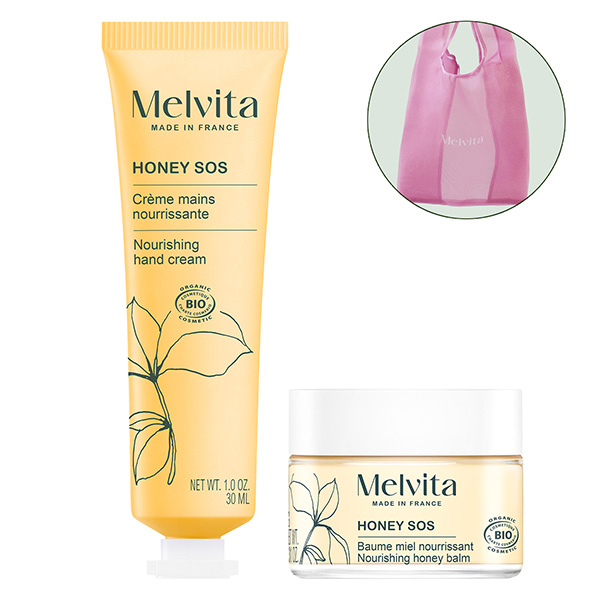 乾燥をケアし、手肌を柔らかく整えるハニーハンドクリームとオーガニックハニー(*1)とアルニカ(*2)で唇を乾燥から守り、うるおいと柔らかさを与えるハニーバームのコフレ。