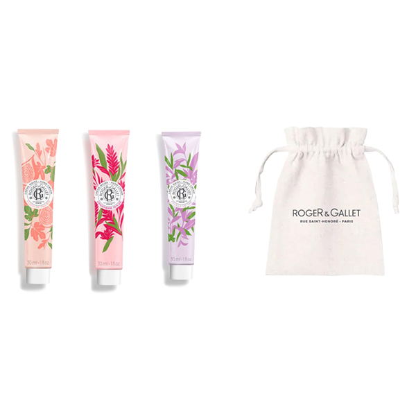 フィグ、ジンジャールージュ、テの人気の香り3種のクレーム マン ハッピーバッグ。