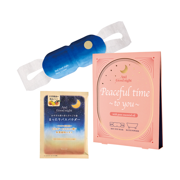 バスパウダー:リラックスオレンジの香り、ホットアイマスク:スリーピーラベンダーの香り