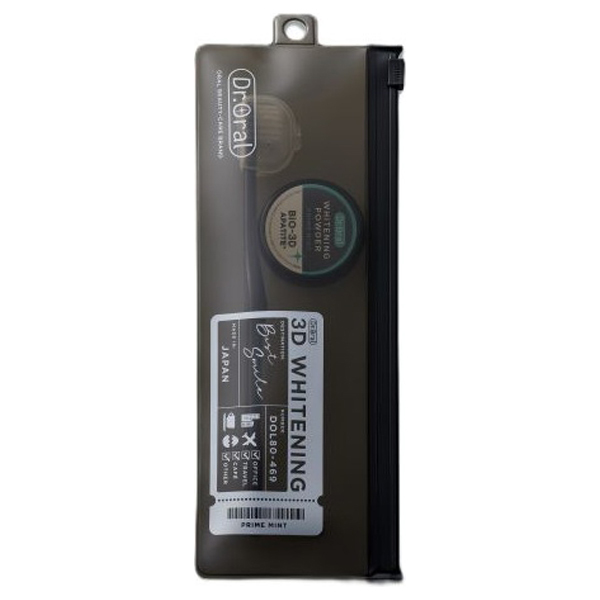旅行先やオフィスでも「粉」ハミガキで歯を白く!※1 『3Dホワイトニングパウダー』のミニサイズ、衛生的なキャップ付きの『ホワイトニングブラシ』、持ち運びやすくスタイリッシュなオリジナル『ポーチ』の3点セット。