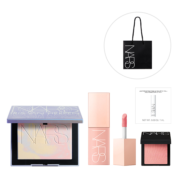 さらに、にじみ出るような発色で頬を染めるブラッシュ Nから人気色777 ORGASM(特製サイズ)と、肌トーンを明るく整えるスキンケアプライマーのサンプル、ショッパーをセットでお届け。