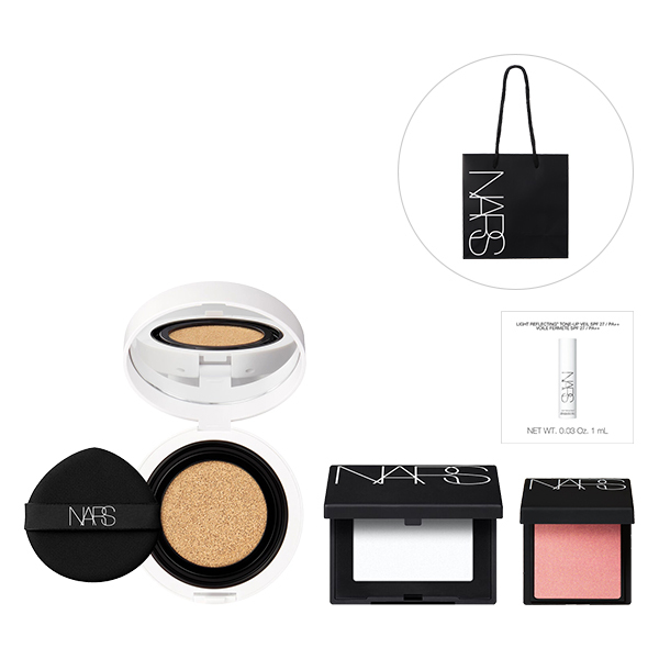さらに、にじみ出るような発色で頬を染めるブラッシュ Nから人気色777 ORGASM(特製サイズ)と、肌トーンを明るく整えるスキンケアプライマーのサンプル、ショッパーをセットでお届け。