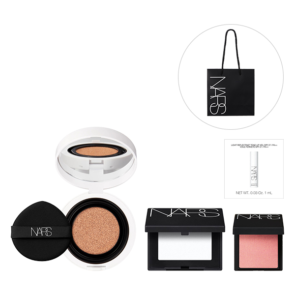 さらに、にじみ出るような発色で頬を染めるブラッシュ Nから人気色777 ORGASM(特製サイズ)と、肌トーンを明るく整えるスキンケアプライマーのサンプル、ショッパーをセットでお届け。