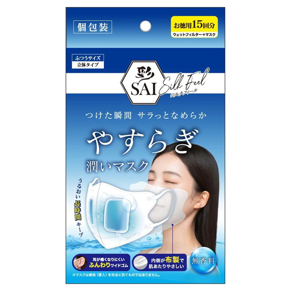 水分たっぷりウェットフィルター 痛くなりにくいワイドゴム 内側布製で肌あたりなめらか ノンアルコールタイプ 独自開発のウェットフィルターポケット ・生地の端が鼻に当たらないから息がしやすい ・フィルターを入れやすい ・寝返りしてもフィルターが落ちにくい