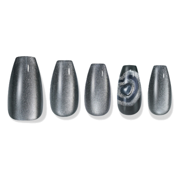 落ち着いたチャコールネイビーにマグネットジェルを重ね、奥行きを生かしたネイル。その上に浮かび上がるハートのドローイングが、愛らしい意外性のある魅力を引き出します。