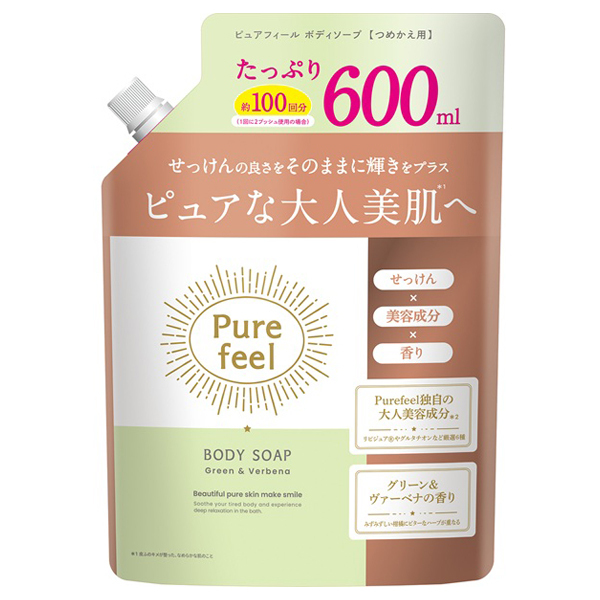 Purefeel(ピュアフィール) ボディソープ グリーン&ヴァーベナの香りを モニターにてお試しさせて頂きました きめ細かいふわふわな軽い泡で、 しっとり洗える 洗いあがりはさっぱり目ですが、 全然つっぱらず、乾燥肌の私でもすっきりしっとりな 感じです 毎日体力を使う仕事で体もくたくたなので、さっぱりしたいい香りのボディソープでもやもやした疲れも吹き飛ぶ 洗い上がりも良く、香りでも癒され大満足のボディソープです