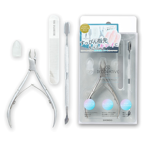 キューティクルニッパー(保護キャップ付き)、プッシャー&スクレーパー、ガラスネイルファイルの3点セットです。