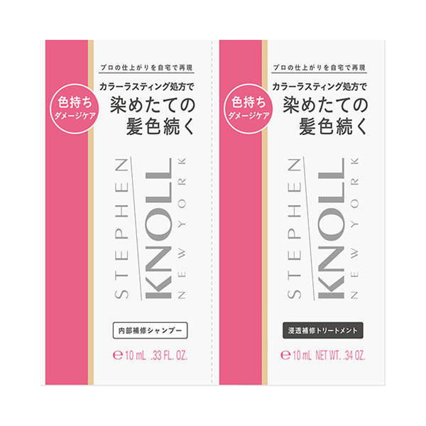 - スティーブンノル カラー ラスティング シャンプー : 水・ココイルメチルタウリンNa・コカミドプロピルベタイン・ラウリルベタイン・香料・トコフェロール・加水分解ケラチン(羊毛)・DPG・EDTA-2Na・PPG-2コカミド・イソステアリン酸PEG-50水添ヒマシ油・イソプロパノール・オリーブ脂肪酸エチル・クエン酸・ココイルグルタミン酸TEA・ジラウリン酸PEG-75・ステアルトリモニウムクロリド・ピロ亜硫酸Na・ポリクオタニウム-10・ポリクオタニウム-22・ポリクオタニウム-7・マカデミアナッツ脂肪酸フィトステリル・ラウリン酸PEG-2・ラウロイルメチルアラニンTEA・レブリン酸・加水分解コーンスターチ・炭酸水素Na・フェノキシエタノール・メチルパラベン・安息香酸Na、スティーブンノル カラー ラスティング トリートメント : 水・セテアリルアルコール・PG・ジメチコン・ミネラルオイル・トリエチルヘキサノイン・ベヘントリモニウムクロリド・香料・トコフェロール・加水分解ケラチン(羊毛)・BG・DPG・アモジメチコン・イソプロパノール・エタノール・クエン酸・クエン酸Na・コレステロール・シロキクラゲ多糖体・ジココイルエチルヒドロキシエチルモニウムメトサルフェート・ジココジモニウムクロリド・ジステアリルジモニウムクロリド・ステアルトリモニウムクロリド・セテス-20・セラミドNG・セラミドNP・フェニルトリメチコン・ポリクオタニウム-10・ポリクオタニウム-104・マカデミアナッツ脂肪酸フィトステリル・ラウレス-23・ラウレス-4・ラウレス硫酸Na・フェノキシエタノール・メチルパラベン・安息香酸Na