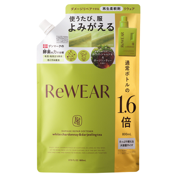 酵素成分「セルラーゼ」が、毛玉・毛羽立ちを分解・除去することで、購入した時に近い状態に服を「よみがえらせる※」ことができる柔軟剤です。