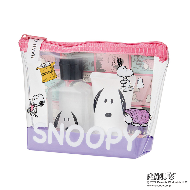 使いやすいサイズのクリアポーチに、持ち運びに便利なミニハンドソープとかわいいハンドクリームが入っています。