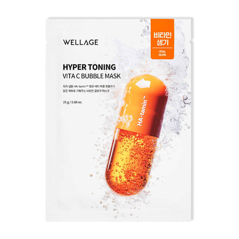 Wellage Hyper Toning Vita C Bubble Mask(ウェラージュ ハイパートーニング ビタC バブルマスク)は、くすみ※が気になる肌をすっきり明るい印象へ導く、ビタミンC配合の泡タイプシートマスクです。