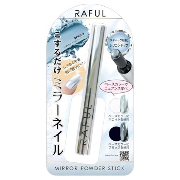 キャップの裏側に固形パウダーがついており、シリコンのチップ部分にパウダーを付着させます。ミラーパウダーはコンテナタイプのものが主流ですが、RAFULミラーパウダーはスティック型のため、これ1本で簡単にミラーネイルが楽しめます。