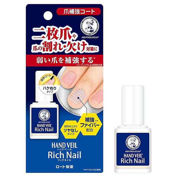 「メンソレータム ハンドベール リッチネイル爪補強コート」は、ハケで塗ってしっかり密着する爪補強コートです。