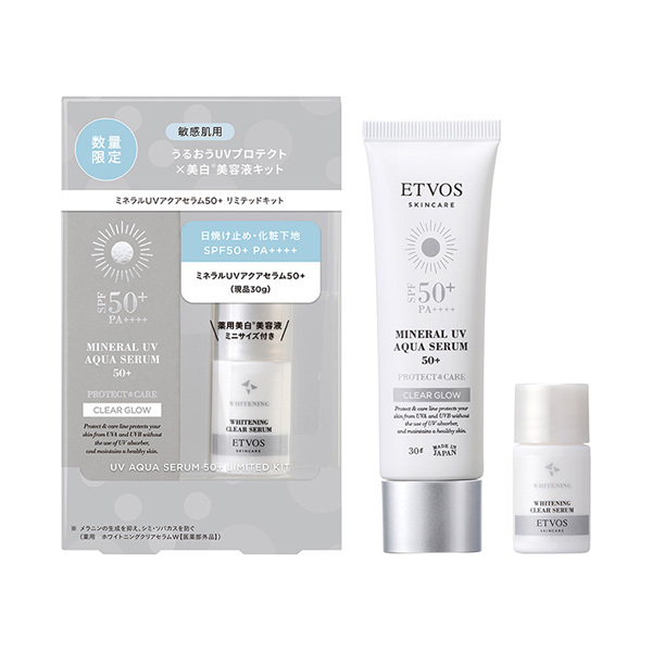 紫外線防御力の高い※1ミネラルUVアクアセラム50+と美白※2美容液のミニサイズ付のお得なキット。