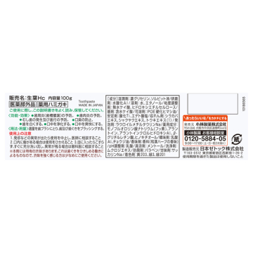 - ・研磨剤:水酸化アルミニウム・溶剤:水、エタノール・湿潤剤:濃グリセリン・基剤:無水ケイ酸・可溶化剤:ポリオキシエチレン硬化ヒマシ油・収れん剤:シラカバエキス、トウキエキス、シャクヤクエキス・安定化剤:酸化チタン、エデト酸二ナトリウム・矯味剤:乳酸アルミニウム、チョウジ油、アラントインクロルヒドロキシアルミニウム・発泡剤:ラウロイルメチルタウリンナトリウム・増粘剤:ヒドロキシエチルセルロース・香味剤:香料(ハーブミントタイプ)・清涼剤:-メントール・薬用成分:-グリチルレチン酸、ヒノキチオール・洗浄剤:ムクロジエキス・防腐剤:パラベン・甘味剤:サッカリンナトリウム・着色剤:黄色4号、青色1号